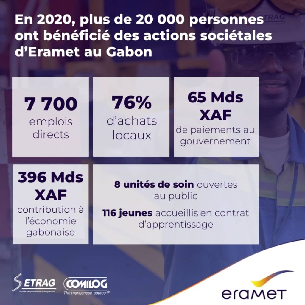 Partenaire stratégique du Gabon sur le plan économique et social depuis plusieurs années, le groupe Eramet s’est encore illustré positivement en 2020 malgré la Covid-19, avec ses 604 M€ d’apport global dans diverses investissements à travers le pays, sur le plan économique et social au grand bonheur des populations qui voient leurs conditions de vie s’améliorer.