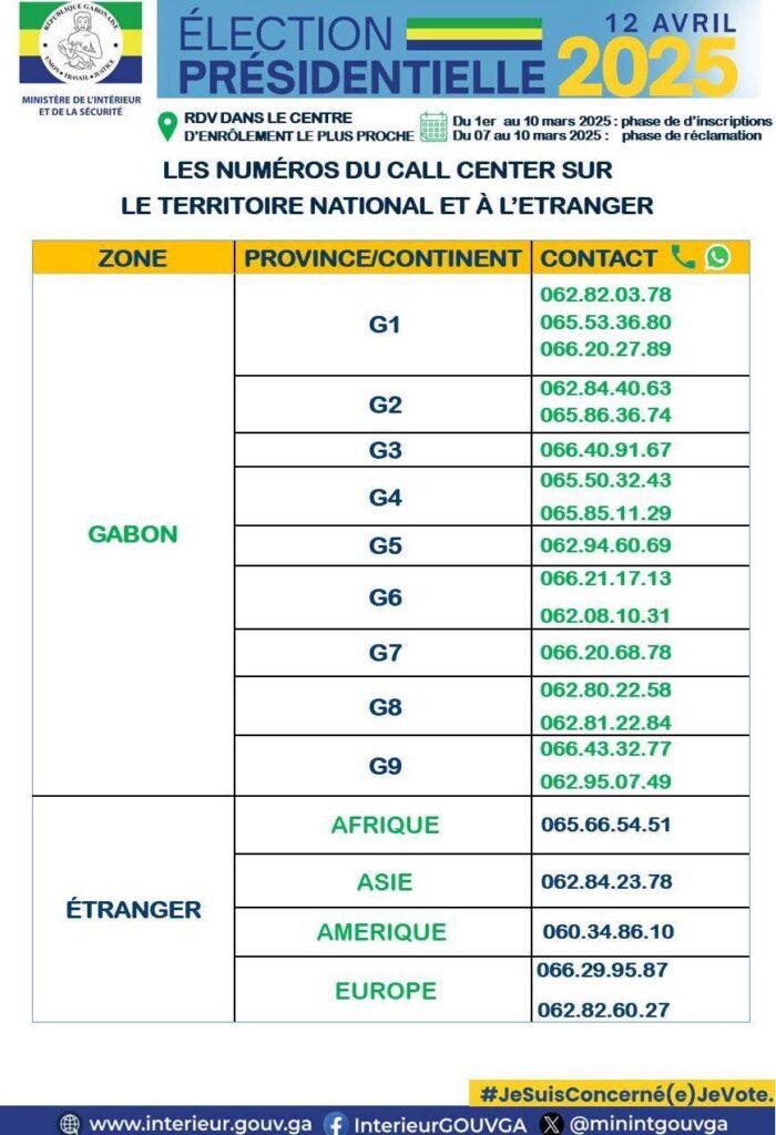 La rédaction 066867376 Globe infos. Libreville, le 09 Mars 2025. Dans le cadre des préparatifs de l’élection présidentielle prévue pour le 12 avril prochain, le ministère de l’Intérieur a franchi une nouvelle étape vers la modernisation du processus électoral. Il y a trois jours, il a procédé à la publication des numéros du Call Center, disponibles aussi bien sur le territoire national qu’à l’étranger, permettant ainsi aux électeurs de finaliser leur inscription sur la liste électorale.