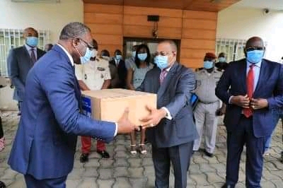 Libreville le mercredi 22 avril 2020, Le premier ministre Gabonais Julien Nkoghe qu’accompagnait le Dr Max Limoukou le Minsanté a réceptionné des mains du représentant de l’Organisation Mondiale de la Santé (OMS) au Gabon un important don d’équipements de protection qu’il tout de suite transmis au Minsanté, afin de permettre aux personnels soignants gabonais de bénéficier d’une meilleure protection face au coronavirus. Ce premier lot est composé d’équipements de protection individuelle (EPI).