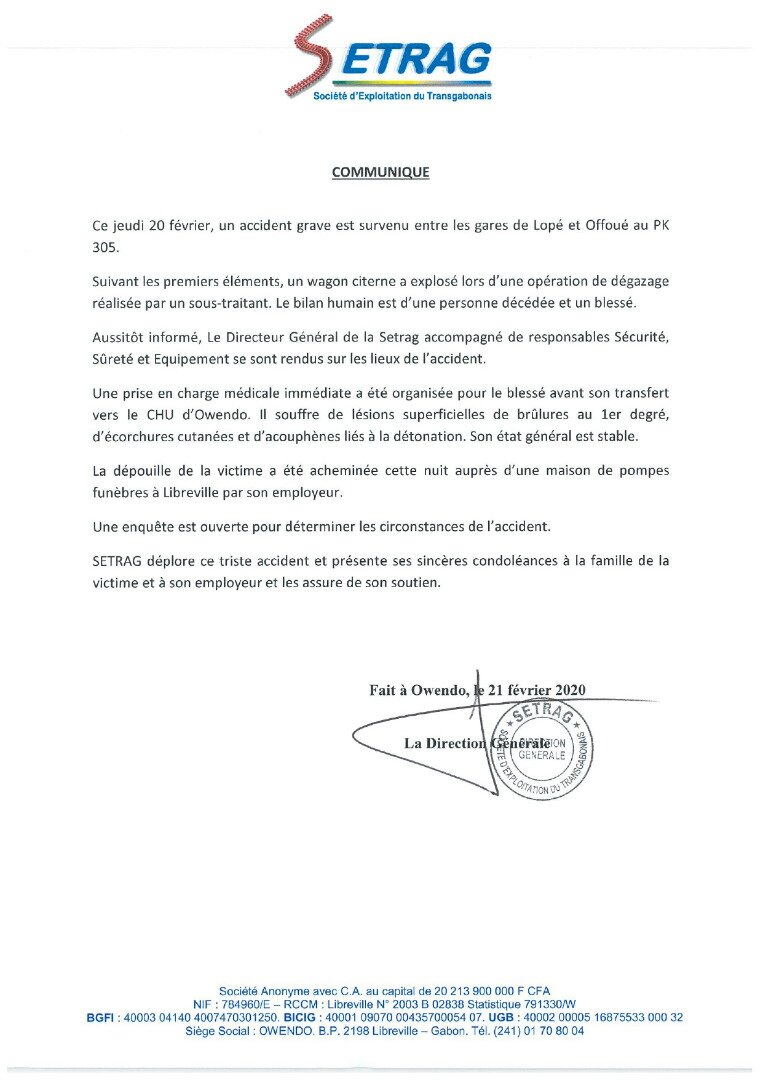 C’est dans un communiqué rédigé par le service communication de la trans-gabonaise, que l’opinion publique a été informée sur cet énième accident qu’a enregistré cette entreprise ce 20 février 2020 aux environs de 16h survenu entre la gare de Lopé et celle d’Offoué.