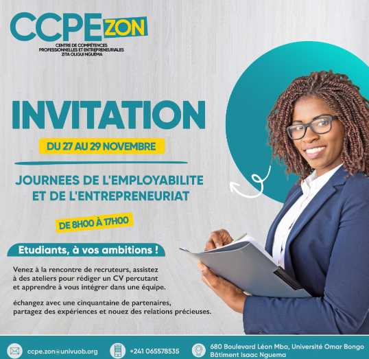 Par Piaco la plume de Globe infos. Du 27 au 29 novembre, le Centre de Compétences Professionnelles et Entrepreneuriales Zita Oligui Nguema (CCPE’ZON), situé à l’Université Omar Bongo, accueille des centaines de jeunes lors des Journées de l’Employabilité et de l’Entrepreneuriat. Une initiative soutenue par la Fondation de la Première Dame “À Ma Manière” et portée par Youpi, pour accompagner les étudiants dans leur insertion professionnelle.