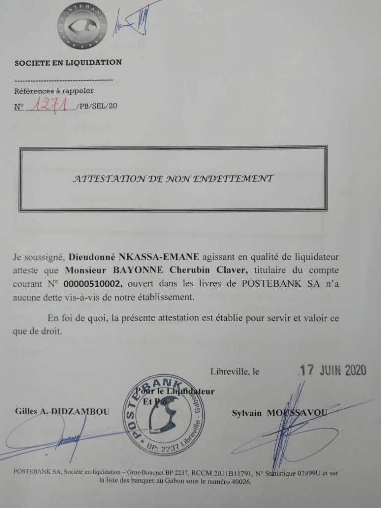 1°). Je n’ai jamais contracté un crédit de 190 millions FCFA et à ce jour, je n’ai aucun encours crédit à POSTEBANK (Cf. ATTESTATION DE NON ENDETTEMENT N° 1271/PB/SEL/20 du 17 Juin 2020), disponible dans les archives de Postebank en Liquidation, et jointe en annexe.