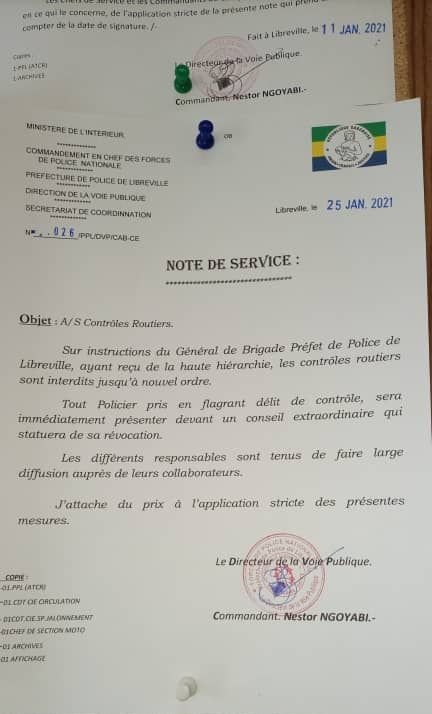 Libreville le 28 Janvier 2021 (Globe infos). Depuis deux jours une note de service dont la source est attribuée à la préfecture de police circule dans tous les plates formes de communication. Et dans celle-ci nous pouvons aisément constater qu’elle date du 25 janvier 2021 dernier et elle suspend tous les contrôles de police sans aucune forme de mesure.