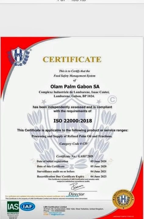 En obtenant ce heureux sésame, les produits Olam palm Gabon peuvent maintenant s’imposer sur le marché mondial sans crainte aucune. Olam palm Gabon vient de démontrer tout le sérieux qui le leur dans ce qu’ils font depuis bientôt dix ans.